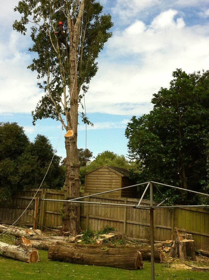 stückweises Abtragen eines toten Eukalyptus-Baumes in Auckland/Neuseeland